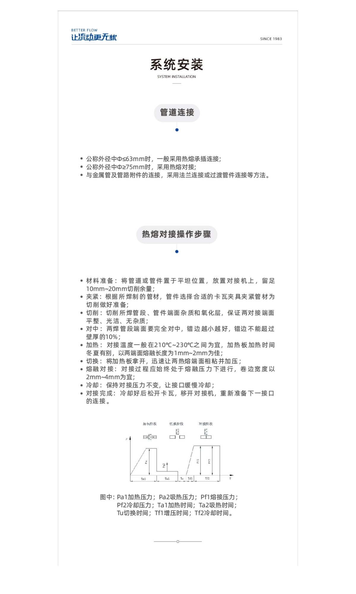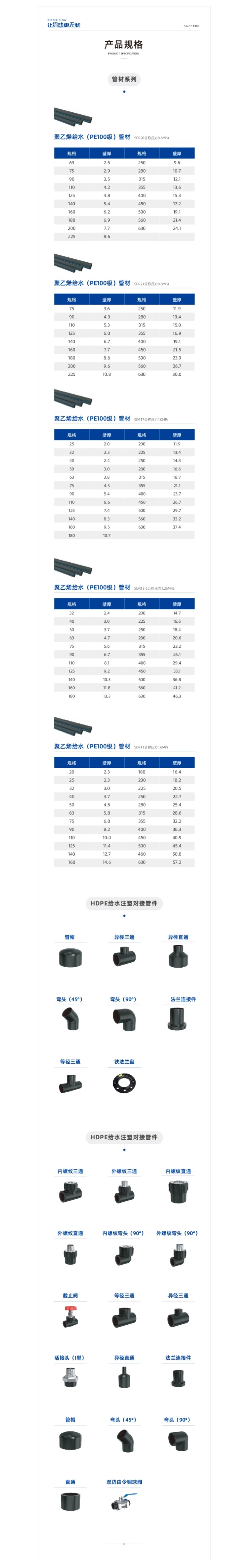 以PE80級、PE100級專用料為原料,按照GB/T13663進行設計和生產,給水(shuǐ)用PE管道的規格應根據其設計的連續工作溫度、工作壓力、使用壽命而選用。一般情(qíng)況下,PE管道適用於輸送介質溫度不高於40℃,工作壓力不(bú)大於1.0MPa。