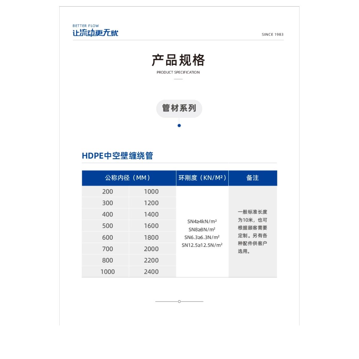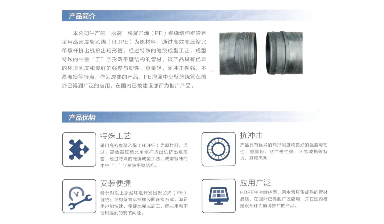 產品執(zhí)行標準為GB/T 19472.2《埋地用聚乙烯(xī)(PE)結構壁管道係統 第(dì)2部分:聚(jù)乙烯纏繞結構壁(bì)管材(cái)》,具有優異的環剛度和良好的強度與韌性,重量輕、耐衝擊性強,不易破損等特點,產(chǎn)品技術成熟,在國外已得到廣泛應用,在國內已被建設部評為推(tuī)廣產品。